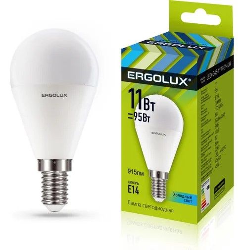 Светодиодная лампа ERGOLUX LED-G45-11W-E14-6K мощностью 11Вт с цветовой температурой 6500K подходит для жилых и офисных помещений, а также уличных светильников с защитой не менее IP54.