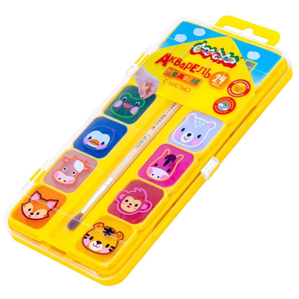 Акварель 24 цвета с кистью в ярком жёлтом пенале в эксклюзивном цвете Каляка-Маляка! Каждая кювета украшена своим персонажем, чтобы ребенок мог запоминать цвета. Пленка защищает краски от перетекания и попадания пыли. Детская акварель Каляка-Маляка - это профессиональное качество, адаптированное для малышей! Она имеет идеально подобранную цветовую гамму, необходимую для развития творческих способностей ребенка. В наборе 24 ярких насыщенных цветов. Краски быстро высыхают и не портятся со временем. Изготовлены на основе натуральных компонентов, не содержат токсичных веществ. Безопасны при использовании по назначению. Акварель выпускается в пластиковой упаковке с европодвесом и прозрачной крышкой, квадратной формой кювет. Упаковка обладает компактными размерами и легким весом. Размер - 18,7х9,3х1,6 см. В набор входит качественная кисточка для рисования красками.