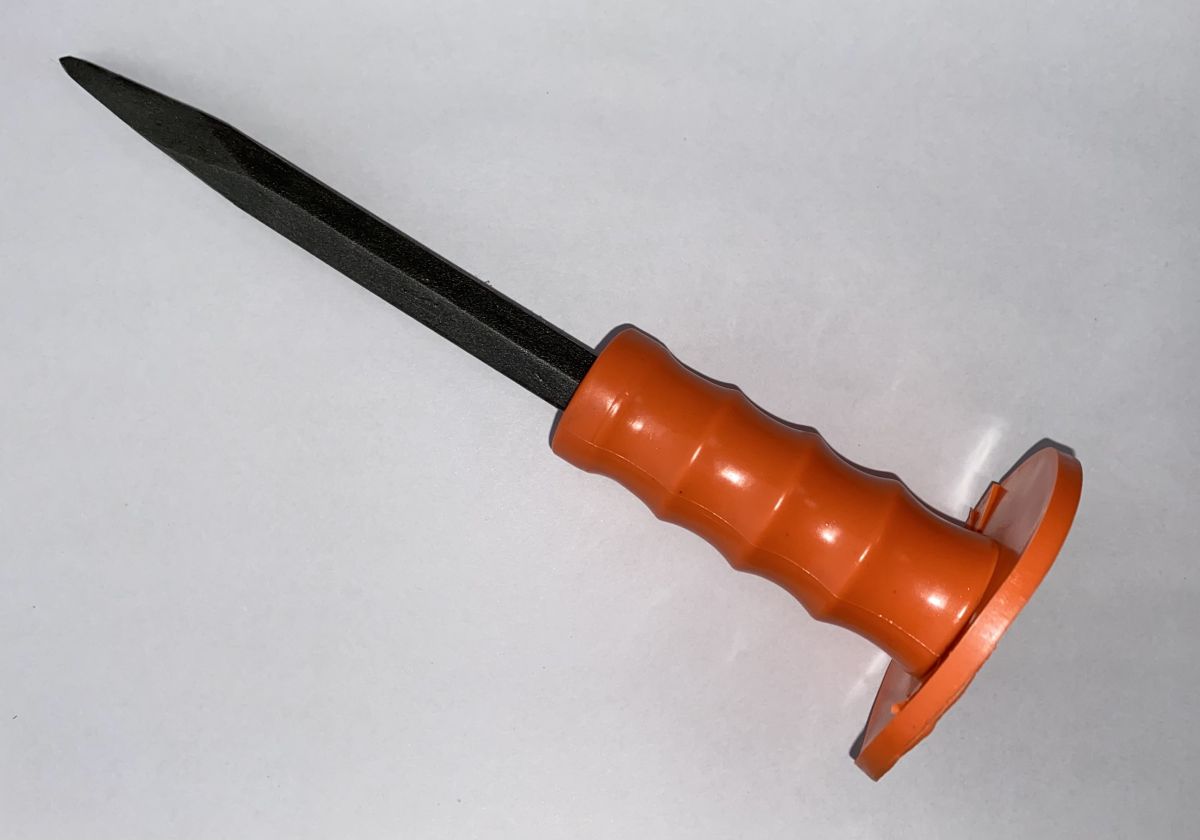Рабочая часть инструмента выполнена из ударопрочной инструментальной стали. Прорезиненный протектор на рукоятке имеет удобную форму, способствует надежному хвату и защищает руки от удара молотком.