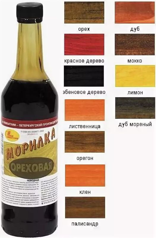 Сфера применения: Морилка наносится кистью, валиком, тампоном или распылителем на предварительно подготовленные (очищенные и зашкуренные) поверхности в один или несколько слоёв до достижения требуемой интенсивности цвета. При многослойном нанесении время промежуточной сушки — 2 часа. Через 12 часов после нанесения поверхность можно отполировать мягкой щеткой или куском материи. Расход при нанесении кистью в один слой — 120–150 мл/м2. При необходимости разбавлять "Растворителем №1", "Ксилолом" марки "Новбытхим" или растворителями Р-4, Р-5.
