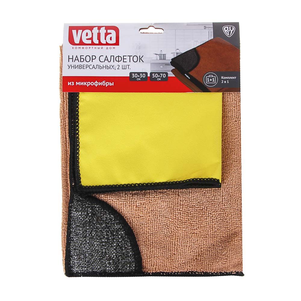 Универсальный набор салфеток от Vetta. Ими протирают мебель от пыли, моют окна и зеркала. Микрофибра. Салфетки не оставляют разводы и не царапают поверхности. Подходят, чтобы мыть и вытирать насухо стеклянные поверхности. В наборе 2 салфетки размером 30 х 30 см и 50 х 70 см.