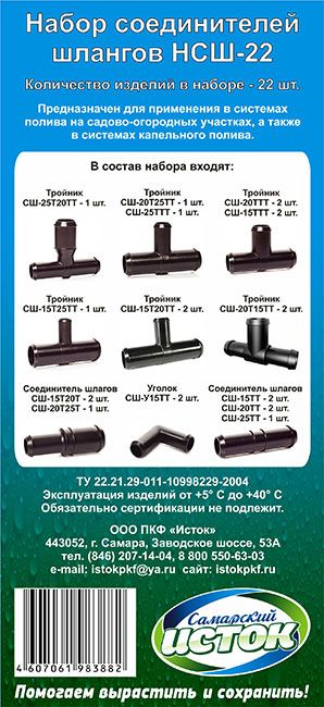 Набор соединителей шлангов НСШ-22 - предназначен для применения в системах полива на садово-огородных участках, а также в системах капельного полива.